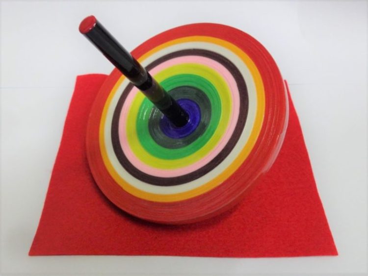 The time have passed and nowadays this type of spinning toys you can find only in Kyoto. And they all are made only in our shop, and we have only two artisans here – my wife and me. Nowadays we have 2 major types of traditional kyo-koma. The first one is a classic type of traditional kyo-koma made of silk. The second one is made of colored cotton. Historically, this method has been used for about 100 years. The characteristic feature of the such kyo-koma is that you can express patterns like the annual rings of a tree in a colorful way. Also, this one is easier to balance because of the type of cloth they are used. It`s easier to work with cotton than with silk fabric. It helps you to create different pattern and various shapes of koma. This is the mainstream of kyo-koma nowadays.