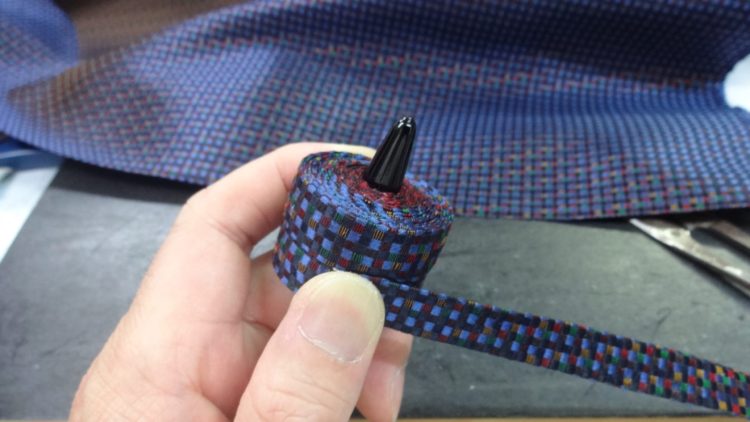 First of all, we prepare materials, for example – cotton. Usually it looks like paper, but it is glued together like a bed sheet, so it is rough and a bit stiff. Another one is the stick for the core. I mainly use bamboo for small one. For the larger stuff, I use wood. First step is to apply some glue on the tip of the fabric and wrap it tightly around the core. If we use some stripes of different color, we wind it up one by one. The key here is to roll it up strongly with a certain amount of force. When we finish this process, we fix the shape into a mortar shape and then check the overall balance. After that, to make it harder you should overcoat it several times and it will be completed in about a week.