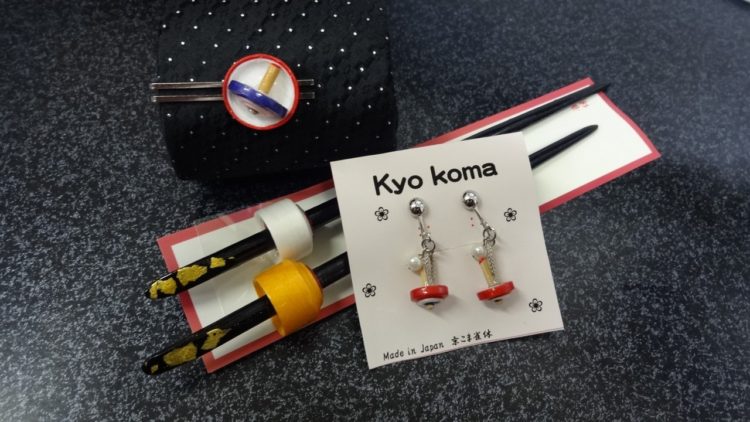 Creating kyo-koma we can make not only a toy itself, but it can also be different type of accessory such as earrings, brooch, pin etc., or decoration for chopsticks, necktie and etc. And sure, we have a lot of classic kyo-koma of different types and shapes: two-stage koma where you turn the top of the stuff, fruits-shape koma, vegetable series which are made by motif of vegetables indigenous to Kyoto and known as kyo-yasai. There is also a gorgeous kyo-koma with pure gold leaf on it. Another one is a kyo-koma of the halberd of Gion Matsuri, a famous festival in Kyoto.